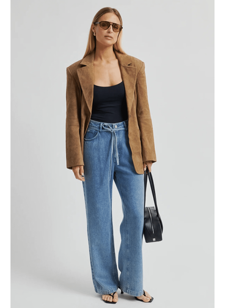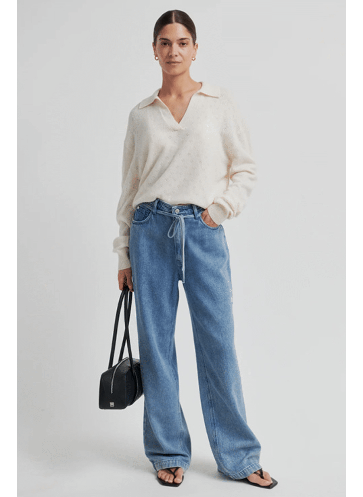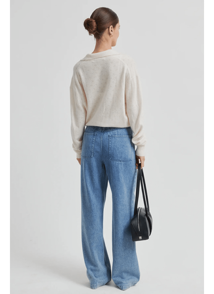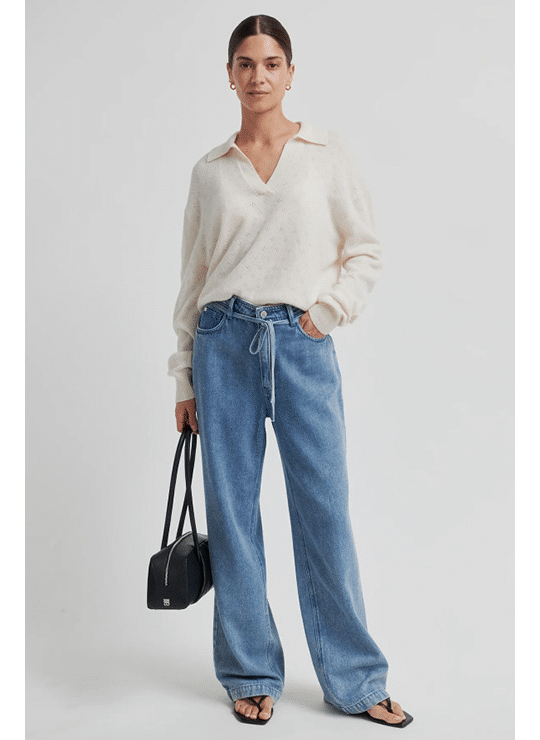 - Mid-high waist with wide, straight legs