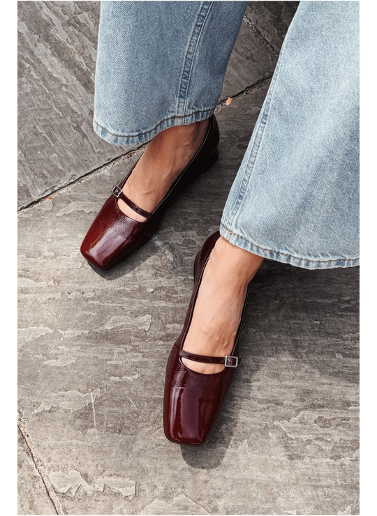 Bordeaux lacquer open shoes with a delicate strap at the front. Can be worn with or without a sock. Ideal for pimping up your outfit.